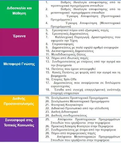 Το U-Multirank το οποίο δημιουργήθηκε από την Ευρωπαϊκή Επιτροπή και συγχρηματοδοτείται από το πρόγραμμα Erasmus +, είναι ένα εργαλείο ετήσιας κατάταξης των Πανεπιστημίων, με στόχο την ταξινόμηση τους από ένα ευρύτερο φάσμα συντελεστών, που ξεπερνά τους παραδοσιακούς δείκτες άλλων γνωστών κατατάξεων. Το U-Multirank, σε αντίθεση με τους αντίστοιχους φορείς ranking, δεν δημοσιεύει λίστες κατάταξης, αλλά συγκρίνει τις επιδόσεις των Ιδρυμάτων εξετάζοντας 29 συνολικά δείκτες που ταξινομούνται σε πέντε ευρείες διαστάσεις: Διδασκαλία και Μάθηση (Teaching and Learning), Έρευνα (Research), Μεταφορά Γνώσης (Knowledge Transfer), Διεθνή Προσανατολισμό (International Orientation) και Συνεισφορά στις Τοπικές Κοινωνίες (Regional Engagement). Οι δείκτες βαθμολογούνται σε κλίμακα που ποικίλει από το «Α» (πολύ καλό) έως το «Ε» (αδύναμο) (βλέπε πίνακα 1).