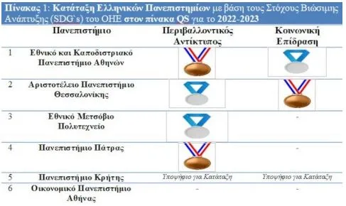 Στη φετινή παγκόσμια κατάταξη Πανεπιστημίων της QS, επισημάνθηκε και πάλι η ερευνητική εστίαση των ιδρυμάτων σε δύο μεγάλες κατηγορίες Στόχων Βιώσιμης Ανάπτυξης (SDG“s). Στα διακριθέντα ιδρύματα απονεμήθηκε ένα μετάλλιο – Χρυσό, Ασημένιο, Χάλκινο ή χαρακτηρίστηκαν ως «Υποψήφια» για ένταξη – το οποίο αντικατοπτρίζει τον αντίκτυπο της ερευνητικής παραγωγής τους σε έναν συγκεκριμένο τομέα της βιώσιμης ανάπτυξης. Υπήρξε ομαδοποίηση των δεικτών σε δύο κατηγορίες: