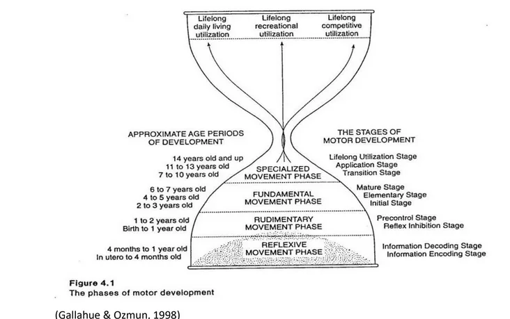 Σύμφωνα με την παραπάνω εικόνα, που περιγράφει τα Στάδια κινητικής εξέλιξηςκατά Gallahue (1998), στην ηλικία 2-7 ετών, θα πρέπει να έχουν κατακτηθεί οι θεμελιώδεις – βασικές κινήσεις. «Η παρέλευση των κρίσιμων περιόδων χωρίς την αναστολή των αντανακλαστικών και την εμφάνιση των στοιχειωδών κινήσεων σημαίνει αναπτυξιακή καθυστέρηση». (Gallahue & Ozmun, 1998, Κουτσούκη, 1997). Σ’ αυτό το σημείο υπενθυμίζουμε το άρθρο 4 του Διεθνή Καταστατικού Χάρτη Φυσικής Αγωγής και Αθλητισμού της UNESCO (1978) όπου διευκρινίζεται ότι: «Η διδασκαλία, η προπόνηση και η διοίκηση στη Φυσική Αγωγή και τον Αθλητισμό πρέπει να ασκείται από ειδικά εκπαιδευμένο προσωπικό». Σας ενημερώνουμε ότι ήδη από το μακρινό 1982 ο Υφυπουργός Παιδείας Πέτρος Μώραλης δήλωνε στη Βουλή ότι «Στην πρότασή σας ν’ αρχίζει η Φυσική Αγωγή από τη προσχολική ηλικία, τούτο ασφαλώς αποτελεί θεμέλιο της σωστής κατεύθυνσης, όχι μόνο για τη βιοκινητική ανάπτυξη του ατόμου, αλλά και για την καλλιέργεια υψηλού αθλητισμού». (Διδασκαλικό Βήμα Φύλλο 927 1982 σελ. 10).