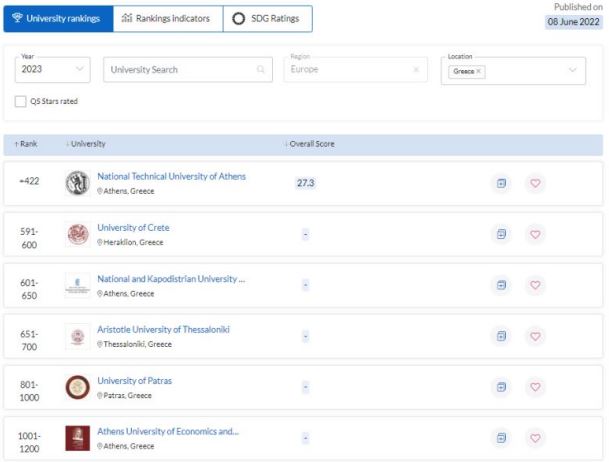 Στην παγκόσμια κατάταξη των πανεπιστημίων QS World University Rankings 2023, το Εθνικό Μετσόβιο Πολυτεχνείο κατατάσσεται στη θέση 422 και στη θέση 45 μεταξύ των Ευρωπαϊκών Πανεπιστημίων στην περιοχή Engineering and Technology.