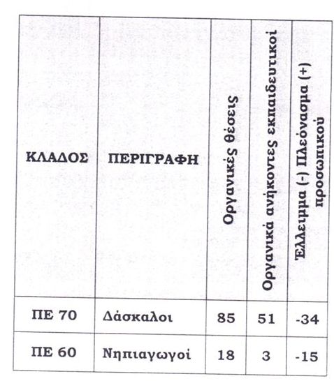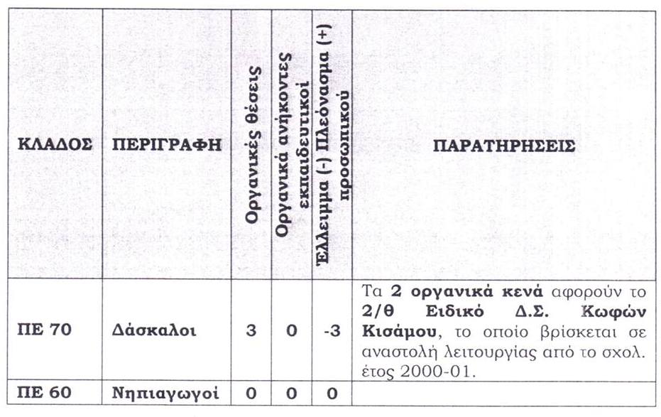 Προσδιορίστηκαν τα οργανικά κενά που θα σταλούν στην Περιφερειακή Διευθυνση Εκπαίδευσης και από εκεί στο Υπουργείο Παιδείας για να πραγματοποιηθούν οι μεταθέσεις. Σε αυτά δε συμπεριλήφθηκαν οι φετινές αιτήσεις συνταξιοδότησης αλλά συνυπολογίστηκαν οι οργανικές υποβαθμίσεις του 7ου, του 12ου και του 18ου Δ.Σ. Χανίων . Τα οργανικά κενά προκύπτουν αφαιρώντας από τις οργανικές θέσεις τους οργανικά ανήκοντες σε κάθε κατηγορία.