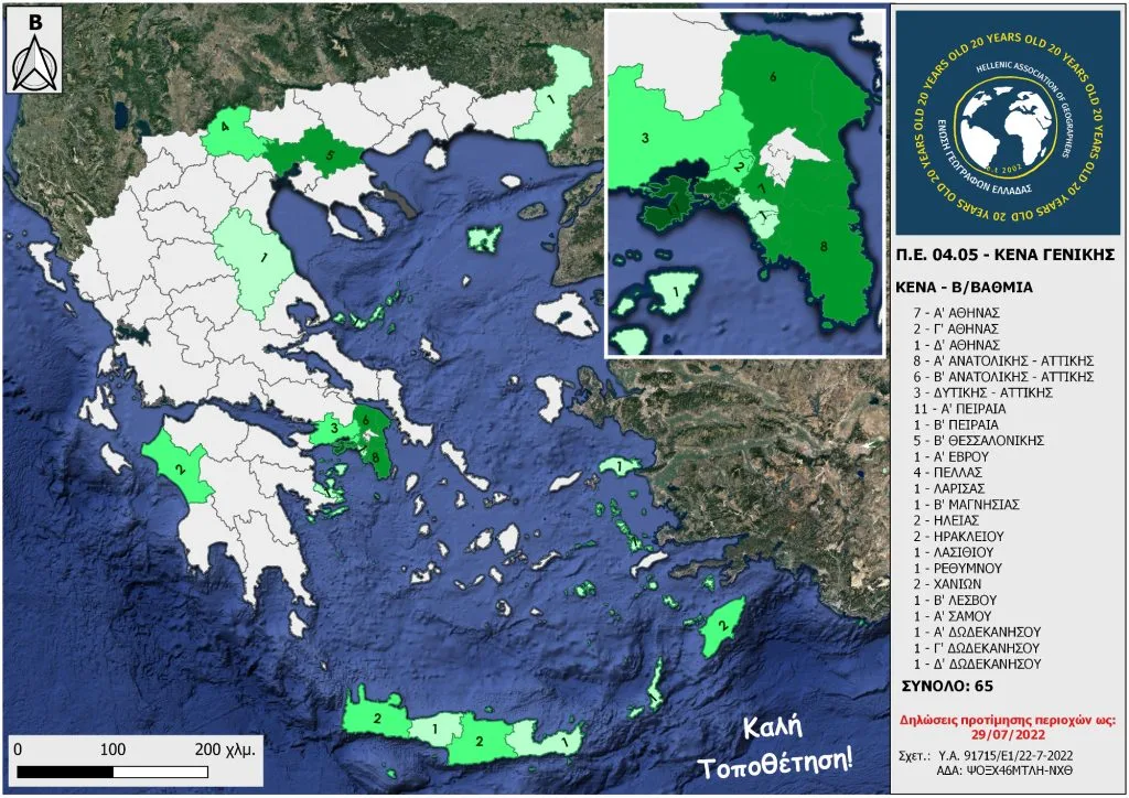 Για την καλύτερη προετοιμασία των συναδέλφων Γεωγράφων -και Γεωεπιστημόνων Π.Ε. 04.05 γενικότερα- στη δήλωση επιλογής περιοχών διορισμού Γενικής και Ειδικής Αγωγής Δευτεροβάθμιας Εκπαίδευσης, η Ένωση Γεωγράφων Ελλάδας προχώρησε σε χαρτογραφική αποτύπωση των κενών ανά Διεύθυνση Δευτεροβάθμιας, όπως περιγράφονται στην δημοσιευθείσα Υπουργική Απόφαση!