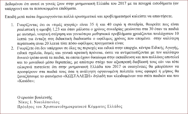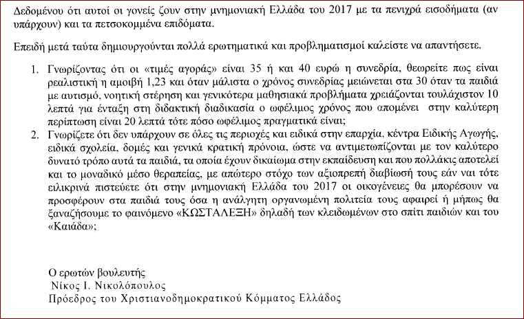 Επίκαιρη Ερώτηση του βουλευτή Αχαϊας προς τον υπουργό υγείας σχετικά με τη μείωση των δαπανών στην ειδική αγωγή