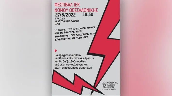 Σπουδαστικό φεστιβάλ οργανώνουν οι Σύλλογοι Σπουδαστών Δημόσιων ΙΕΚ (ΣΥΣΔΙΕΚ) και ο Σύλλογος Σπουδαστών Ιδιωτικών Σχολών (ΣΥΣΠΙΣ) Θεσσαλονίκης την Παρασκευή 27 Μάη στις 6.30 μ.μ. στα γρασίδια της Φιλοσοφικής του ΑΠΘ.