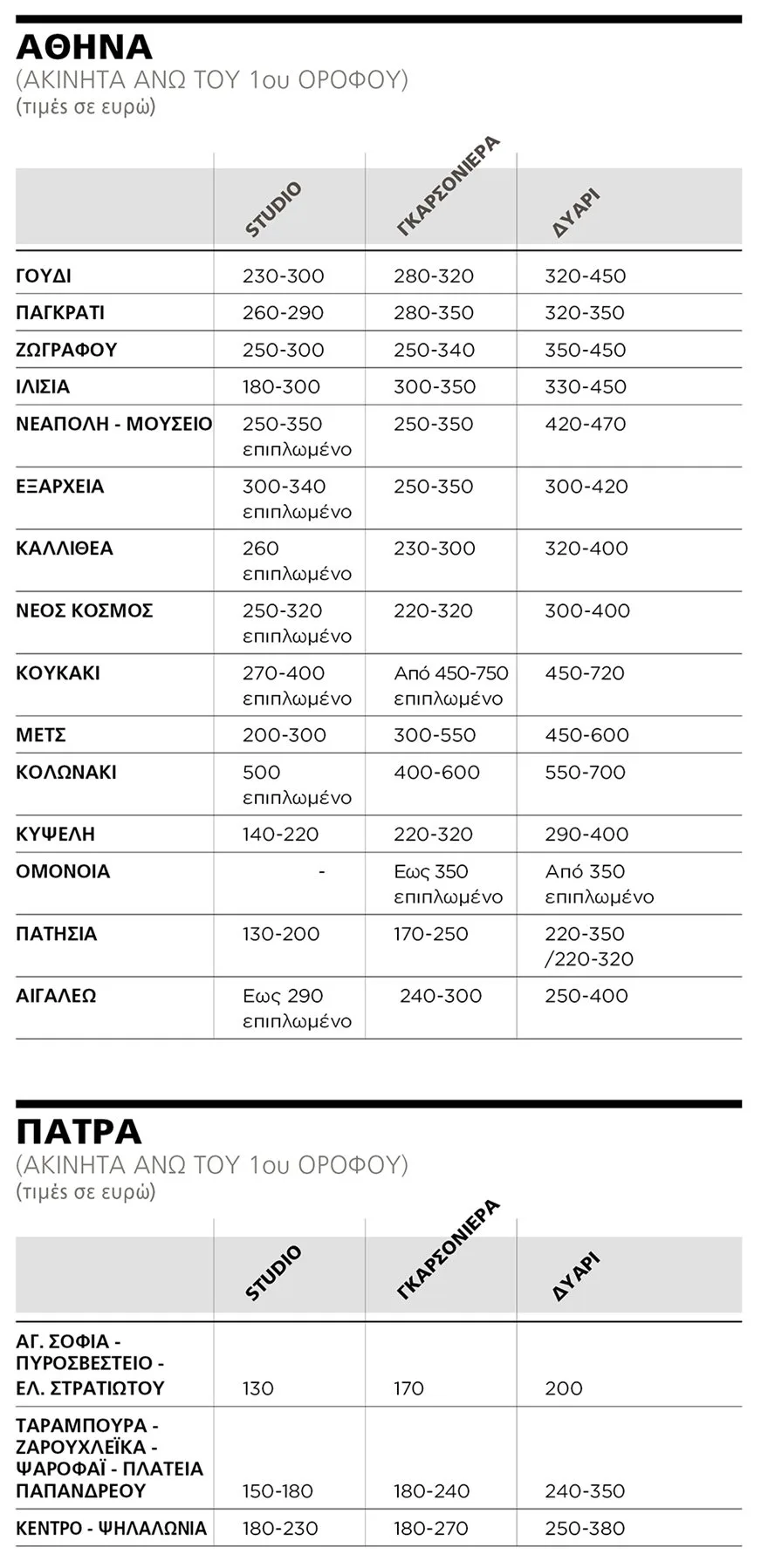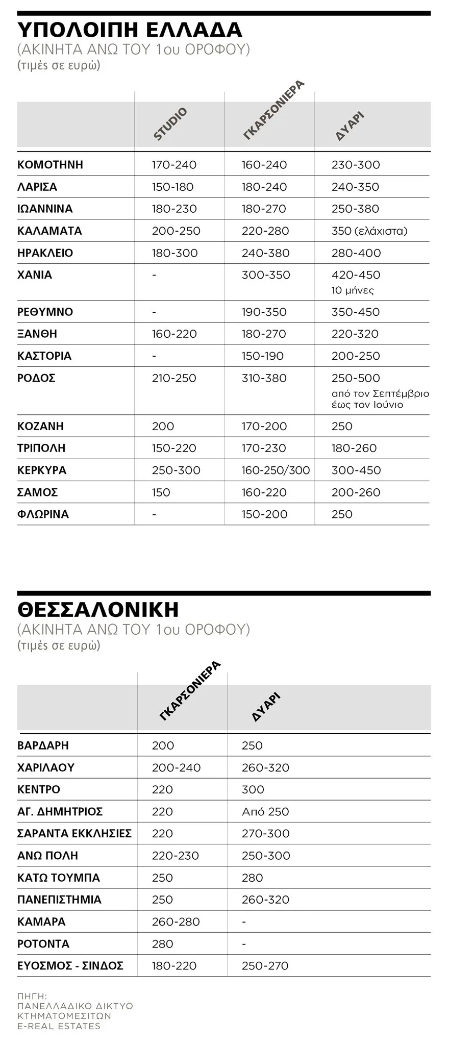 Ετσι, στην Αθήνα, όπως προκύπτει από την έρευνα που πραγματοποίησε η E-Real Estates, υπάρχει περιορισμένη προσφορά για φοιτητικά σπίτια και άνοδος στα ενοίκια, φτάνοντας κατά περίπτωση ακόμη και το 30% σε σύγκριση με πέρυσι. Η έρευνα έρχεται να επιβεβαιώσει την εκτίμηση της Πανελλήνιας Ομοσπονδίας Ιδιοκτητών Ακινήτων και του προέδρου της Σταύρου Παραδιά ότι πολλά από τα σπίτια που ανακαινίστηκαν και επιπλώθηκαν για βραχυχρόνια μίσθωση έχουν αρχίσει να επιστρέφουν στην αγορά ακριβώς με βάση τα δεδομένα ότι έχει αυξηθεί η προσφορά και έχει στενέψει ο κλοιός γύρω από τα αδήλωτα σπίτια. Ωστόσο, όπως επισημαίνει στο «ΘΕΜΑ» ο κ. Θέμης Μπάκας, πρόεδρος της E-Real Estates, «οι τιμές αυτών των ακινήτων είναι πολύ υψηλές, χωρίς μάλιστα να περιλαμβάνουν τις δαπάνες από τους λογαριασμούς κοινής ωφέλειας από τους οποίους επιβαρύνονται οι ιδιοκτήτες στις βραχυχρόνιες μισθώσεις». Ενδεικτικά η έρευνα του κτηματομεσιτικού δικτύου κατέγραψε τιμές για μια επιπλωμένη φοιτητική γκαρσονιέρα στο Κουκάκι έως 750 ευρώ, ενώ ένα μη επιπλωμένο δυάρι διατίθεται μεταξύ 450 και 720 ευρώ. Στη λίστα των κατοικιών για φοιτητές έχει αυξηθεί η προσφορά σε επιπλωμένα ακίνητα, ακόμη και στην Ομόνοια, όπου οι τιμές για επιπλωμένες γκαρσονιέρες είναι μέχρι τα 350 ευρώ και για δυάρια, επίσης επιπλωμένα, από 350 ευρώ και πάνω – άλλη μία περίπτωση ακινήτων που επιστρέφουν από τη βραχυχρόνια στη μακροχρόνια μίσθωση.