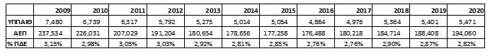 Με βάση, λοιπόν, όλα τα έγγραφα που κατατέθηκαν στη Βουλή για το 2020 (Υπουργείο Οικονομικών, 2019) και κυρίως την Εισηγητική Έκθεση (Υπουργείο Οικονομικών, 2019)[2] και τον Κρατικό Προϋπολογισμό 2019 (Υπουργείο Οικονομικών, 2019)[3], οι δαπάνες του Κρατικού Προϋπολογισμού (Τακτικός + Πρόγραμμα Δημοσίων Επενδύσεων) ανέρχονται στα 5,5 δις ευρώ.