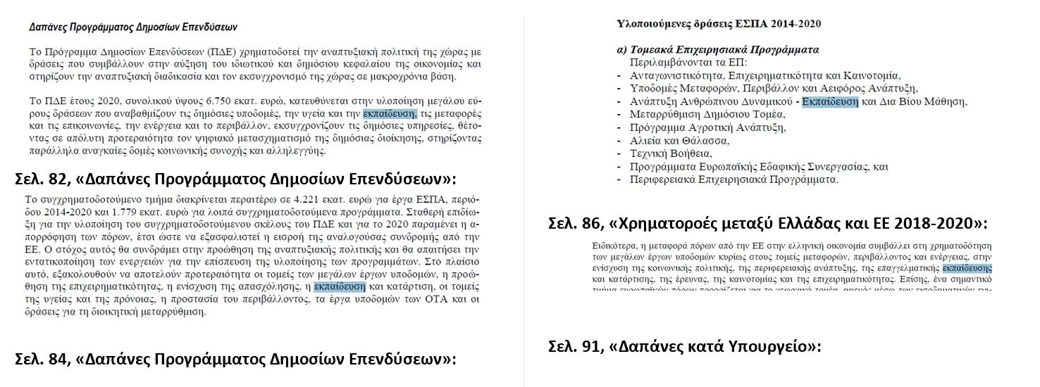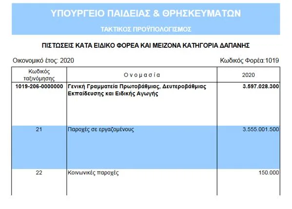 «….Και επειδή άλλοι εξαγγέλλουν και άλλοι πραγματικά υλοποιούν, τονίζω ότι ο προϋπολογισμός του 2020 περιλαμβάνει τους διορισμούς 4.500 μόνιμων εκπαιδευτικών, ΕΕΠ και ΕΒΠ στην πρωτοβάθμια και δευτεροβάθμια Ειδική Αγωγή και Εκπαίδευση, καθώς και τους διορισμούς 5.250 μόνιμων εκπαιδευτικών, υπό τη Μείζονα Κατηγορία 21 «Παροχές σε εργαζόμενους» (του Ειδικού Φορέα 1019-206-0000000 «Γενική Γραμματεία Πρωτοβάθμιας, Δευτεροβάθμιας Εκπαίδευσης και Ειδικής Αγωγής»)……»