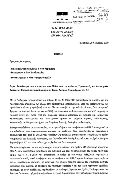 Ερώτηση προς τους Υπουργούς Παιδείας και Θρησκευμάτων, Εθνικής Άμυνας, Ναυτιλίας και Νησιωτικής Πολιτικής και Προστασίας του Πολίτη