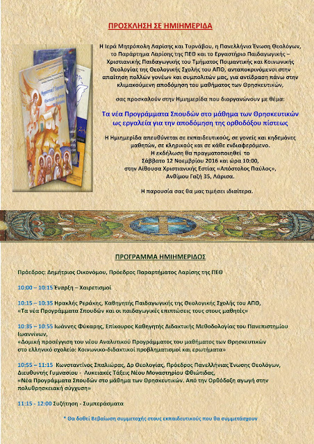 Η Ιερά Μητρόπολη Λαρίσης και Τυρνάβου, η Πανελλήνια Ένωση Θεολόγων, το Παράρτημα Λαρίσης της ΠΕΘ και το Εργαστήριο Παιδαγωγικής – Χριστιανικής Παιδαγωγικής του Τμήματος Ποιμαντικής και Κοινωνικής Θεολογίας της Θεολογικής Σχολής του ΑΠΘ, ανταποκρινόμενοι στην απαίτηση πολλών γονέων και συμπολιτών μας, για αντίδραση πάνω στην κλιμακούμενη αποδόμηση του μαθήματος των Θρησκευτικών, σας προσκαλούν στην Ημιημερίδα που διοργανώνουν με θέμα: