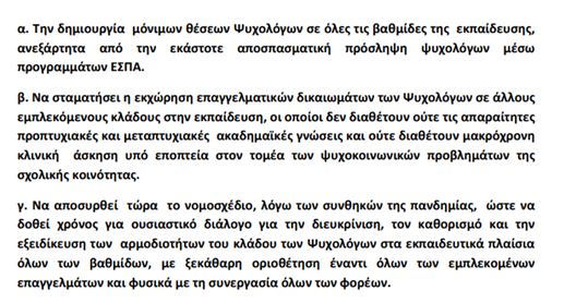 Ο Σύλλογος Ελλήνων Ψυχολόγων στην υπ. Αριθμ. Πρωτ.: 134917/4-5-2020 επιστολή του προς την υπουργό Παιδείας με θέμα: «Θέσεις ΣΕΨ για το νομοσχέδιο του Υπουργείου Παιδείας «Αναβάθμιση του σχολείου και άλλες διατάξεις», αναφέρει μεταξύ άλλων ότι διαμαρτύρεται έντονα ότι το ΥΠΑΙΘ συνεχίζει να μη λαμβάνει υπόψιν τα μακροχρόνια αιτήματα του κλάδου των Ψυχολόγων στο συγκεκριμένο νομοσχέδιο και ζητάει δείτε εδώ:
