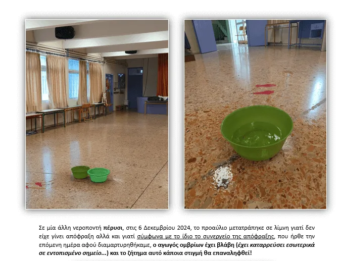 – Την χθεσινή νεροποντή, με ταβάνια να στάζουν σε αίθουσες και αυτές να γεμίζουν νερά. Πέρα από τις φωτογραφίες αναζητείστε τα παρακάτω βίντεο και τις περιγραφές:
