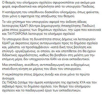 Ως ΠΑΣΑΔ ζητάμε την άμεση κατάργηση της σχετικής ΚΥΑ και τον σεβασμό προς το δημόσιο σχολείο, τον θεσμό του ολοήμερου σχολείου και το παιδαγωγικό έργο των εκπαιδευτικών.