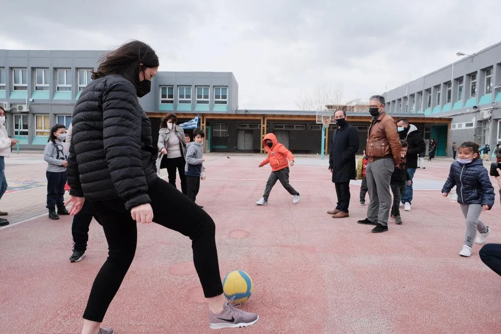 Η Υπουργός συζήτησε με τα παιδιά, άκουσε τους τρόπους με τους οποίους οι συμμαθητές και οι εκπαιδευτικοί τους τα έχουν υποδεχτεί και ενσωματώσει, δείχνοντάς τους παιχνίδια, μαθαίνοντάς τους λέξεις στα ελληνικά. Ο μικρός Αλέξανδρος είπε στην Υπουργό ότι του άρεσε πολύ το ποδόσφαιρο και έπαιξαν μαζί, καθώς και με τους συμμαθητές του, στο προαύλιο.