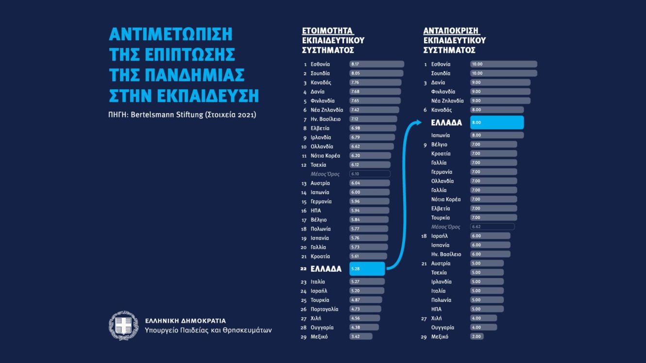 Έρευνα του Bertelsmann Stiftung σε χώρες ΟΟΣΑ (OECD) δείχνει ότι όταν αναλάβαμε την ηγεσία το 2019, η ετοιμότητα της χώρας μας για να αντιμετωπίσει την πανδημία στην εκπαίδευση ήταν από τις χαμηλότερες σε χώρες του ΟΟΣΑ, στην 22η θέση.