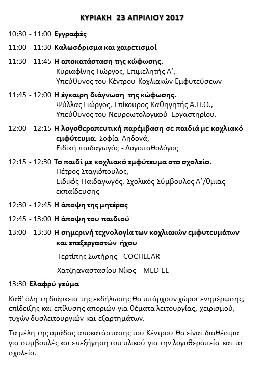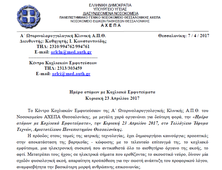 Κυριακή 23 Απριλίου 2017: Ημέρα ατόμων με Κοχλιακά Εμφυτεύματα -στο Τελλόγλειο Ίδρυμα Τεχνών ΑΠΘ Newsroom Ipaidia 11/04/2017 - 16:05 20170411160511/04/201716:05--20170411160511/04/201716:05 Κυριακή 23 Απριλίου 2017: Ημέρα ατόμων με Κοχλιακά Εμφυτεύματα -στο Τελλόγλειο Ίδρυμα Τεχνών ΑΠΘ