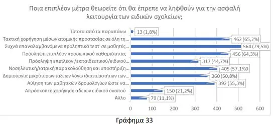 Η ανάγκη λήψης αυτών των μέτρων επιβεβαιώνεται και από τις απαντήσεις των συμμετεχόντων στην έρευνα, που εξακολουθούν όλο αυτό το διάστημα να εργάζονται στα Ειδικά Σχολεία Δευτεροβάθμιας Εκπαίδευσης (ΣΜΕΑΕ, ΕΝΕΕΓΥΛ και ΕΕΕΕΚ) με την φυσική τους παρουσία, παρά τις δυσκολίες που έχουν τα παιδιά να τηρήσουν τα υγειονομικά πρωτόκολλα, προσφέροντας σημαντικό έργο στους/στις μαθητές/τριές τους και τις οικογένειές τους.