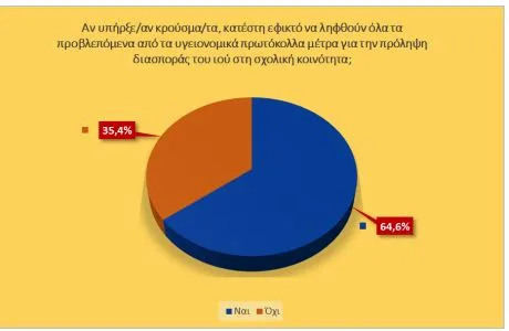 Σε ερώτηση για το αν έχουν γίνει προληπτικά τεστ Covid-19 σε μαθητές των ειδικών σχολείων, το 34% απάντησε καθόλου, το 23% είπε ελάχιστα, το 17% μέτρια, το 15% αρκετά και το 11% πολύ καλά.