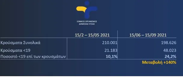 Είναι χαρακτηριστικό ότι μεταξύ 15/6/2021 και 15/9/2021, δηλαδή τους καλοκαιρινούς μήνες, όταν τα σχολεία ήταν κλειστά, ο αριθμός κρουσμάτων σε νέους κάτω των 19 ετών αυξήθηκε από 238 κρούσματα την ημέρα κατά μέσο όρο (15/2/21-15/5/21) σε 522 κρούσματα την ημέρα κατά μέσο όρο (15/6/21-15/9/21), δηλαδή υπερδιπλασιάστηκε. Αντίστοιχα, το ποσοστό των συνολικών κρουσμάτων COVID-19 που αντιστοιχούσε σε νέους κάτω των 19 ετών αυξήθηκε από 10.1% (15/02/21-15/5/21) σε 24.2% (15/06/21-15/9/21) (βλ. τον παρακάτω πίνακα).
