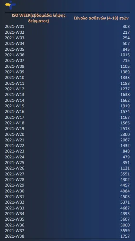 Σύμφωνα με τα επίσημα στοιχεία του ΕΟΔΥ, τον Ιούλιο 2021 ο εβδομαδιαίος αριθμός κρουσμάτων στην ηλικιακή ομάδα 4-18 ετών ήταν 4324 κατά μέσο όρο. Τον Αύγουστο 2021, ο εβδομαδιαίος αριθμός κρουσμάτων στην ίδια ηλικιακή κατηγορία ήταν 4738 κατά μέσο όρο.
