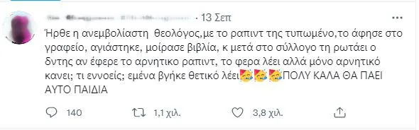 Συγκεκριμένα, κάποιος έκανε tweet σύμφωνα με το οποίο η καθηγήτρια θεολογίας πήγε κανονικά τη Δευτέρα (13.09.2021) στον αγιασμό του σχολείου της στη Λαμία αν και το rapid test που έκανε ήταν θετικό.