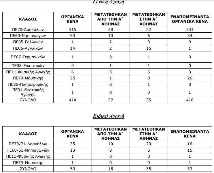 Μετά την ανακοίνωση των μεταθέσεων από ΠΥΣΠΕ σε ΠΥΣΠΕ Γενικής και Ειδικής Αγωγής το εκπαιδευτικό τοπίο, στη Διεύθυνση Π.Ε. Α΄ Αθήνας, διαμορφώνεται ως εξής: