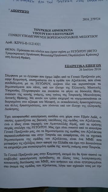 Υ.Γ. Το παραπάνω έγγραφο αποδεικνύει για ακόμη μία φορά το ρόλο του φασιστικού κράτους της Τουρκίας στη Θράκη, το οποίο δυστυχώς βρίσκει πολλούς πρόθυμους και φοβισμένους και από την Ελλάδα. Ο γράφων το γνωρίζει από προσωπική εμπειρία……