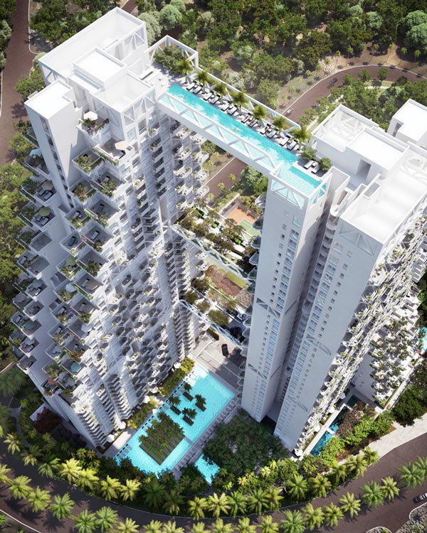 και 509 δωματίων, σχεδιαστικό αποτέλεσμα του αρχιτέκτονα Moshe Safdie που αναμένεται να ολοκληρωθεί μέχρι το 2016 στη Σιγκαπούρη. Κι αν το ύψος αλλά και το design δεν σας ενθουσιάζει, σίγουρα τα βλέμματα κλέβει η εντυπωσιακή πισίνα του συγκροτήματος. Βρίσκεται στον τελευταίο όροφο των κτηρίων εν είδει γέφυρας που συνδέει τις δύο δομές μεταξύ τους.