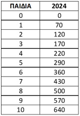 Επίδομα οικογενειακής παροχής:Μετά τις πρόσφατες αυξήσεις με τον Νόμο 5045/2023, το επίδομα αυτό είναι επιπλέον 70 ευρώ μικτά για πρώτο παιδί, 50 ευρώ επιπλέον για δεύτερο, 50 ευρώ επιπλέον για τρίτο, 50 ευρώ επιπλέον για τέταρτο παιδί και 70 ευρώ επιπλέον για πέμπτο παιδί και πέρα. Αυτό δίνεται μέχρι το 18ο έτος του τέκνου και μέχρι το 24ο αν φοιτά σε μεταλυκειακό ίδρυμα.