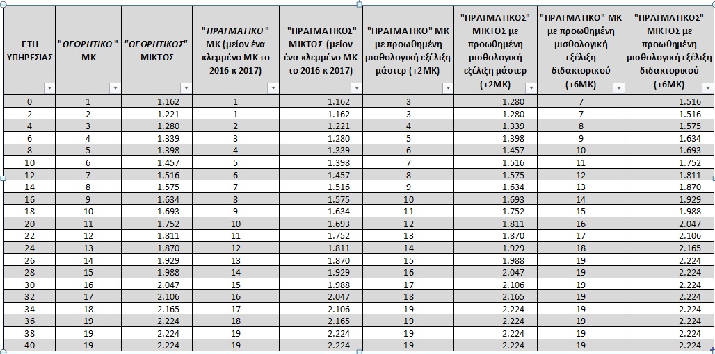 Ας τα δούμε αυτά με ένα απλό παράδειγμα: ένας εκπαιδευτικός σήμερα με 17 χρόνια υπηρεσίας κανονικά θα έπρεπε να είναι στο ΜΚ 9 και να παίρνει 1.634 ευρώ μικτά. Λόγω «κλοπής» του ενός ΜΚ, είναι σήμερα στο ΜΚ 8 και παίρνει μικτά 1.575 ευρώ. Αν έχει μεταπτυχιακό, όμως, παίρνει αυτόματα 2 ΜΚ και πάει στο ΜΚ 10 οπότε φτάνει τα 1.693 ευρώ. Αν έχει διδακτορικό, παίρνει 6 ΜΚ (προσοχή: αθροιστικά με το μάστερ, δηλόχι επιπλέον 6 αλλά επιπλέον 4 του μάστερ) και φτάνει το ΜΚ14 δηλ παίρνει 1.929 ευρώ μικτά μηνιαίως.