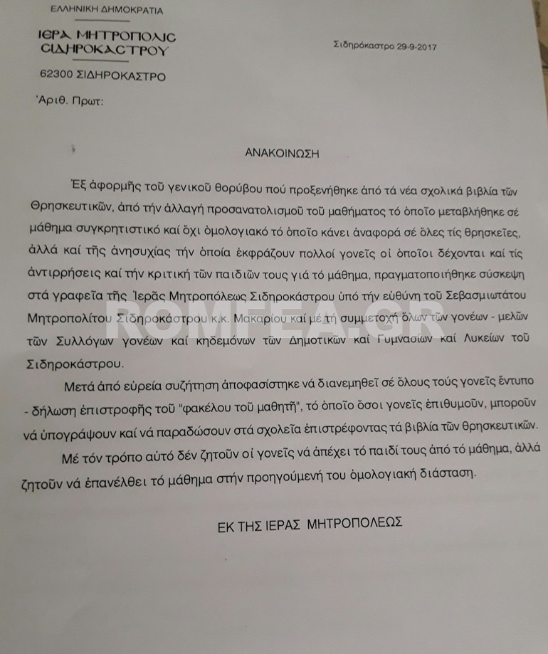 Απόφαση της σύσκεψης ήταν η διανομή σε όλους τους γονείς των μαθητών, εντύπου δήλωσης επιστροφής του “Φακέλου του μαθητή”, δηλαδή την υπογραφή των γονέων που επιθυμούν να παραδώσουν τα νέα βιβλία των Θρησκευτικών στα σχολεία τους.