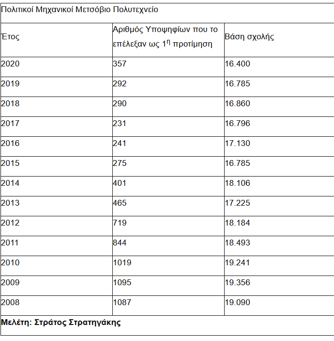 Στον πίνακα βλέπουμε τη ζήτηση για σπουδές στη σχολή Πολιτικών Μηχανικών του Μετσοβίου Πολυτεχνείου. Στη δεύτερη στήλη βλέπουμε τον αριθμό των υποψηφίων που δήλωσαν τη σχολή ως πρώτη επιλογή στο Μηχανογραφικό τους δελτίο και στην τελευταία στήλη τη βάση της σχολής.