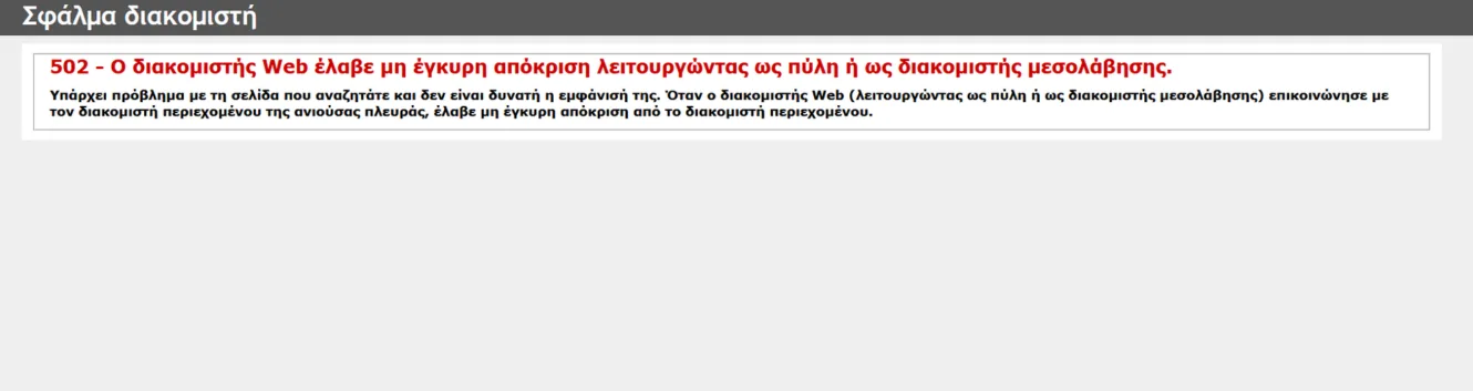 Υπάρχει πρόβλημα με τη σελίδα που αναζητάτε και δεν είναι δυνατή η εμφάνισή της. Όταν ο διακομιστής Web (λειτουργώντας ως πύλη ή ως διακομιστής μεσολάβησης) επικοινώνησε με τον διακομιστή περιεχομένου της ανιούσας πλευράς, έλαβε μη έγκυρη απόκριση από το διακομιστή περιεχομένου.