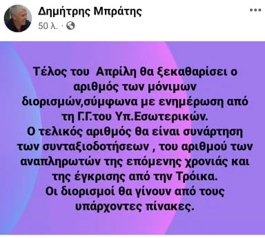 Συγκεκριμένα στην ανάρτησή του αναφέρει πως σύμφωνα με ενημέρωση από την Γενική Γραμματέα του Υπουργείου Εσωτερικών (κα Βιβή Χαραλαμπογιάννη) οι μόνιμοι διορισμοί των εκπαιδευτικών: