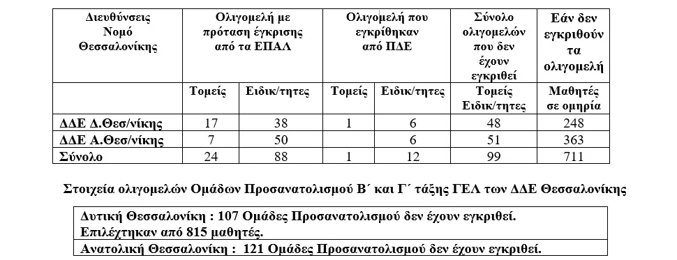 • Τα 99 φτάνουν τα ολιγομελή σε τομείς και ειδικότητες που δεν έχουν ακόμη εγκριθεί στην Θεσσαλονίκη, όπως αποτυπώνεται με στοιχεία από τα σχολεία. Με απόφαση του Περιφερειακού Διευθυντή εγκρίθηκαν μόνο 1 τομέας και 12 ειδικότητες από τα 112 που είχαν προταθεί προς έγκριση από τα ΕΠΑΛ., παρόλο που στη συνάντηση του με τις ΕΛΜΕ-Θ για το συγκεκριμένο θέμα είχε δηλώσει τη θετική του στάση στα αιτήματα μας.