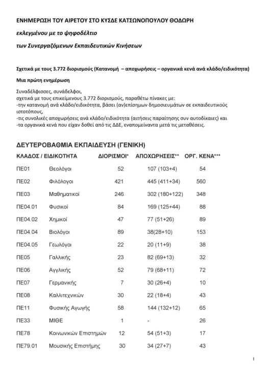ΝΕΑ ενημέρωση σχετικά με τους 3.772 διορισμούς εκπαιδευτικών (Κατανομή – αποχωρήσεις – οργανικά κενά ανά κλάδο/ειδικότητα)