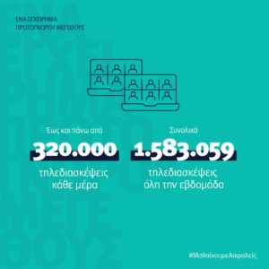 Αυτά είναι τα στοιχεία της τηλεκπαίδευσης για την περασμένη εβδομάδα: πάνω από 6 εκατομμύρια συμμετοχές μαθητών και 320.000 τηλεδιασκέψεις αθροιστικά κάθε μέρα, 55.000 παράλληλες συνεδρίες Νηπιαγωγείων και Δημοτικών, 39.000 παράλληλες συνεδρίες Γυμνασίων και Λυκείων, 18 εκατομ. λεπτά μαθήματος την ημέρα.