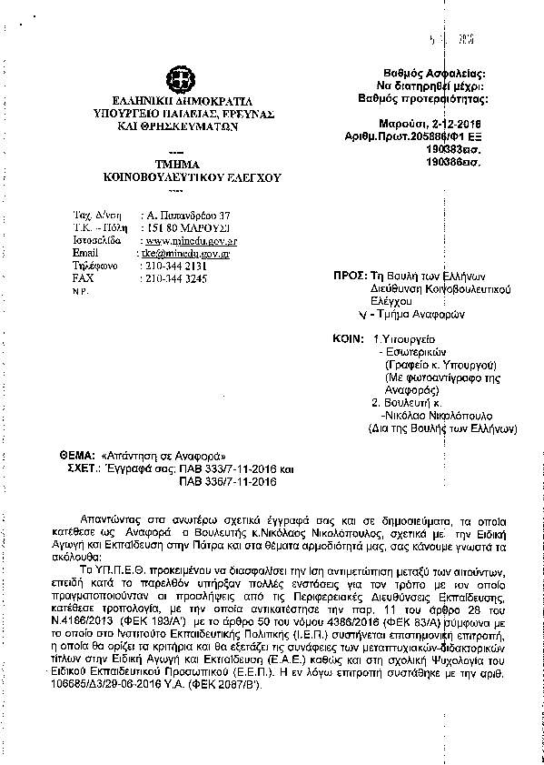 ΤΙ ΑΠΑΝΤΗΣΕ Ο ΥΠΟΥΡΓΟΣ ΠΑΙΔΕΙΑΣ ΣΤΗ ΒΟΥΛΗ ΓΙΑ ΤΙΣ ΠΡΟΣΛΗΨΕΙΣ ΑΝΑΠΛΗΡΩΤΩΝ Ε.Ε.Π. ΚΑΙ Ε.Β.Π. ΣΤΗΝ ΔΥΤΙΚΗ ΕΛΛΑΔΑ
