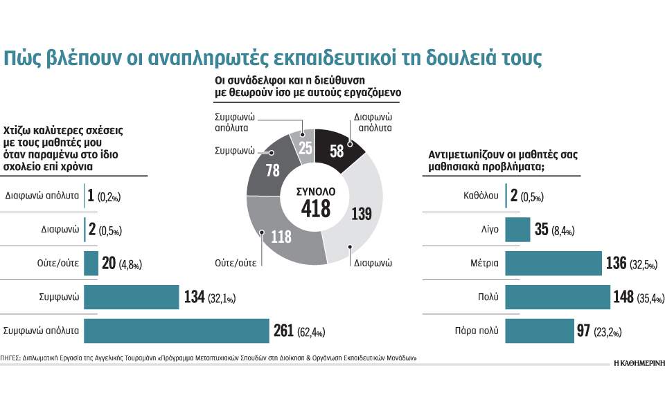 Αυτό το τελευταίο κενό ήρθε να καλύψει έρευνα που πραγματοποίησε το 2018, στο πλαίσιο της διπλωματικής της εργασίας, η εκπαιδευτικός –αναπληρώτρια καθηγήτρια στη Χίο σήμερα– Αγγελική Τουραμάνη, με επιβλέποντα τον επίκουρο καθηγητή ΑΤΕΙΘ δρα Σπυρίδωνα Αβδημιώτη. Η «Κ» παρουσιάζει σήμερα τα σημαντικότερα ευρήματα, ενόψει και της συζήτησης στη Βουλή την Πέμπτη του σχεδίου νόμου του υπουργείου Παιδείας για το νέο σύστημα διορισμών.