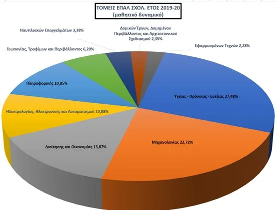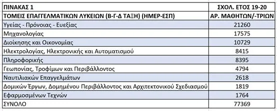 Η κατανομή των μαθητών/-τριών στα Επαγγελματικά Λύκεια τη σχολική χρονιά 2019-20 δείχνει ότι οι τομείς «Υγείας-Πρόνοιας-Ευεξίας» και «Μηχανολογικός» διαθέτουν πάνω από το 50% του μαθητικού δυναμικού τους. Πιο συγκεκριμένα, σπουδάζουν 21.260 μαθητές/-τριες στον πρώτο και 17.575 στο δεύτερο τομέα. Ακολουθούν οι υπόλοιποι τομείς, με μεσαίο ή μικρότερο αριθμό μαθητών/-τριών. Όλοι όμως διαθέτουν εξίσου σημαντικές ειδικότητες και είναι σαφές πως δεν εξαρτάται η σπουδαιότητά τους μόνο από το μαθητικό δυναμικό τους (βλ. πίνακα 1 και διάγραμμα 1).