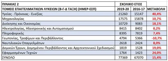 Ο τομέας Εφαρμοσμένων Τεχνών, παρότι είναι από τους τομείς με μικρό μαθητικό δυναμικό (1.764 μαθητές/-τριες πανελλαδικά), έχει μια σημαντική άνοδο την τετραετία αυτή (24%). Ο τομέας Οικονομίας-Διοίκησης παρουσιάζει επίσης μια σημαντική αύξηση κατά 18,1%, όπως και ο τομέας Δομικών Έργων (αύξηση 19%), ενώ μικρότερη αύξηση παρουσιάζουν οι τομείς της Πληροφορικής (κατά 7,4%) και των Ναυτιλιακών Επαγγελμάτων (κατά 8%). Σταθερή δυναμική παρουσία έχει στα ΕΠΑΛ ο τομέας Ηλεκτρολογίας-Ηλεκτρονικής, ενώ ο τομέας Γεωπονίας, Τροφίμων και Περιβάλλοντος παρουσιάζει πτώση (10,7%), πιθανά συγκυριακή, παραμένει όμως ένας πολύ σημαντικός επαγγελματικός τομέας, με προοπτικές ανάπτυξης, ιδιαίτερα για τη χώρα μας.
