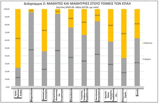 Όπως είναι αναμενόμενο, τα ποσοστά των μαθητών και μαθητριών που φοιτούν στους εννέα διαφορετικούς επιστημονικούς – επαγγελματικούς τομείς των Επαγγελματικών Λυκείων είναι διαφορετικά. Έτσι, ενώ στο σύνολο του μαθητικού δυναμικού των ΕΠΑ.Λ. καταγράφεται ότι το 62,7% είναι αγόρια και το 37,3% είναι κορίτσια, στον τομέα Υγείας-Πρόνοιας-Ευεξίας τα ποσοστά είναι 24,8% αγόρια και 75,2% κορίτσια, ενώ αντιστροφή των ποσοστών παρατηρείται στον Μηχανολογικό τομέα (95,9% αγόρια – 4,1% κορίτσια), αλλά και στον Ηλεκτρολογικό-Ηλεκτρονικό τομέα (93,9% αγόρια – 6,1% κορίτσια). Καλύτερη ισορροπία των φύλων παρατηρείται στους τομείς Οικονομίας – Διοίκησης (45,9% αγόρια – 54,1% κορίτσια) και Δομικών Έργων (58,4% αγόρια – 41,6% κορίτσια). (Βλ. Διάγραμμα 2)