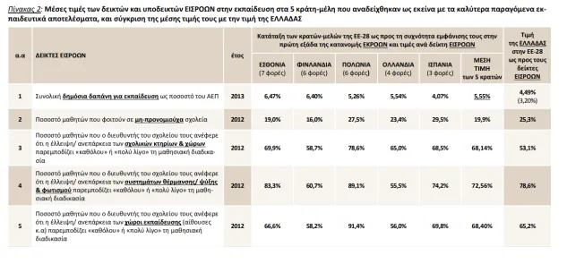 Το τμήμα του Πίνακα που δημοσιεύουμε αναφέρει συγκριτικά στοιχεία από τις εισροές (την επένδυση του κράτους) στην ελληνική δημόσια εκπαίδευση. Είναι χαρακτηριστικό ότι: