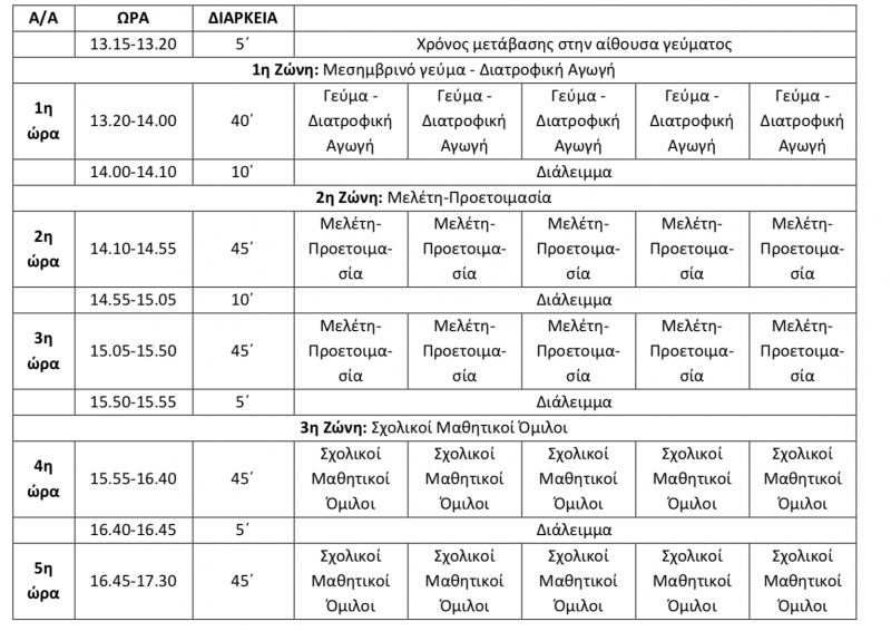 αα) Στην πρώτη (1η) ζώνη, «Μεσημβρινό γεύμα – Διατροφική αγωγή», διάρκειας μίας (1) διδακτικής ώρας καθημερινά, εντάσσεται, επ ́ ευκαιρία και του μεσημβρινού γεύματος, το διδακτικό αντικείμενο της διατροφικής αγωγής, το οποίο ανατίθεται, κατά προτεραιότητα, στους εκπαιδευτικούς που διδάσκουν τη δεύτερη ώρα (14.10 έως 14.55).