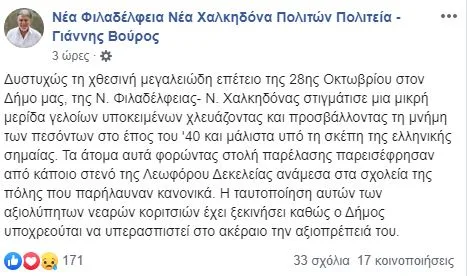 «Δυστυχώς τη χθεσινή μεγαλειώδη επέτειο της 28ης Οκτωβρίου στον Δήμο μας, της Ν. Φιλαδέλφειας – Ν. Χαλκηδόνας στιγμάτισε μια μικρή μερίδα γελοίων υποκειμένων χλευάζοντας και προσβάλλοντας τη μνήμη των πεσόντων στο έπος του ’40 και μάλιστα υπό τη σκέπη της ελληνικής σημαίας.