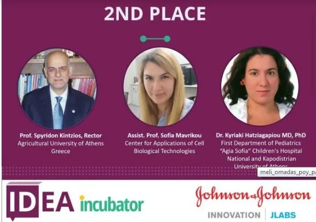 Εικόνα: Από αριστερά προς τα δεξιά τα μέλη της ομάδας που παρουσίασαν την καινόμα μέθοδο στον τελικό του διαγωνισμού Καθηγητής Σπυρίδων Κίντζιος Πρύτανης του Γεωπονικού Πανεπιστημίου Αθηνών, Επίκουρη Καθηγήτρια Σοφία Μαυρίκου του Κέντρου Εφαρμογών Κυτταροβιολογικών Τεχνολογιών και η Μεταδιδακτορική Ερευνήτρια παιδίατρος Κυριακή Χατζηαγαπίου από την Α’ Παιδιατρική Κλινική του Νοσοκομείο Παίδων Η Αγία Σοφία, Ιατρική Σχολή, Εθνικό και Καποδιστριακό Πανεπιστήμιο Αθηνών.