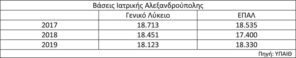 Το 2017 επί υπουργίας κ. Γαβρόγλου το ποσοστό εισαγωγής στα Πανεπιστήμια αυξήθηκε σε 5% από τις εξετάσεις του 2018 και εδώ άρχισαν τα περίεργα. Την πρώτη χρονιά εισαγωγής στα Πανεπιστήμια η βάση της Ιατρικής Αλεξανδρούπολης, που αποτελεί το κατώφλι εισαγωγής, ήταν σχεδόν 200 μόρια χαμηλότερη για τους υποψηφίους από τα ΕΠΑΛ. Δεδομένου ότι τα απαιτούμενα για την εισαγωγή μαθήματα είναι πολύ ευκολότερα στο ΕΠΑΛ το σήμα δόθηκε ότι είναι πιο εύκολη η εισαγωγή στην Ιατρική από ΕΠΑΛ. Το 2018 με την αύξηση του αριθμού των εισακτέων σε 5% η διαφορά μεγάλωσε: Είναι τελείως διαφορετικό να πρέπει να γράψεις 18.451 μόρια με τα μαθήματα του Γενικού Λυκείου και τελείως διαφορετικό να πρέπει να γράψεις 1.000 μόρια λιγότερα με τα μαθήματα του ΕΠΑΛ.