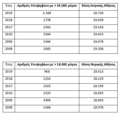 «Αντίστοιχη είναι η κατάσταση και στη βάση της Νομικής Αθήνας. Όταν οι υποψήφιοι με πάνω από 18.000 μόρια είναι λίγοι γύρω στους 1.000, τότε η βάση κυμαίνεται μεταξύ 18.000 και 18.200 μορίων. Όταν οι αριστούχοι είναι περισσότεροι από 3.000 η βάση εκτοξεύεται στα 18.900 μόρια.