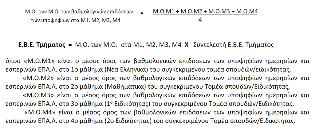 α) Σε σχολές, τμήματα ή εισαγωγικές κατευθύνσεις, οι οποίες είναι προσβάσιμες από έναν (1) τομέα σπουδών, ο οποίος περιλαμβάνει μία (1) Ειδικότητα, η Ε.Β.Ε. διαμορφώνεται ενιαία για τα ημερήσια και εσπερινά ΕΠΑ.Λ. από τον M.O. των Μ.Ο. των βαθμολογικών επιδόσεων των υποψηφίων στα τέσσερα (4) πανελλαδικά εξεταζόμενα μαθήματα (M1, M2, M3, M4) του Τομέα σπουδών/Ειδικότητας, με την επιφύλαξη της περ. β ́ της παρ. 1 του άρθρου 13Δ του ν. 4186/2013, σύμφωνα με τον παρακάτω τύπο: