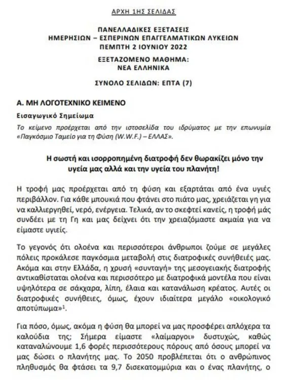 Πανελλήνιες 2022 : Oι μαθητές των ΕΠΑΛ κλήθηκαν να αναλύσουν κείμενο της WWF Ελλάς για τη σωστή διατροφή. Όσα πρέπει να ξέρετε για τις Πανελλαδικές 2022 στο iPaidia.gr