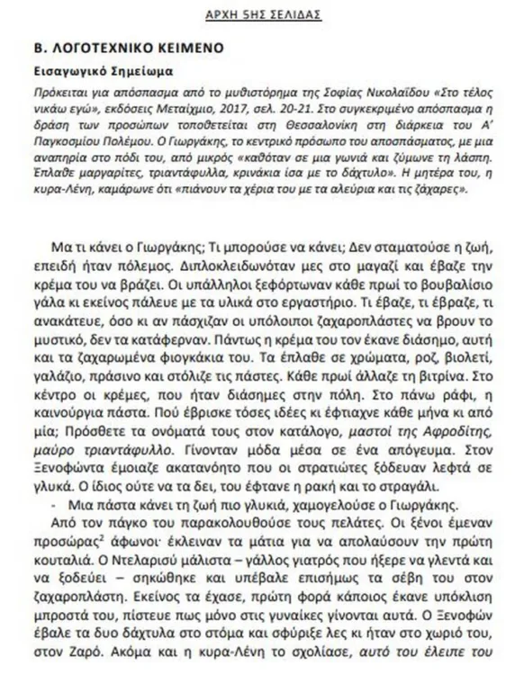 Το λογοτεχνικό κείμενο στο οποίο εξετάστηκαν οι υποψήφιοι ήταν απόσπασμα από το μυθιστόρημα της Σοφίας Νικολαΐδου «Στο τέλος νικάω εγώ».